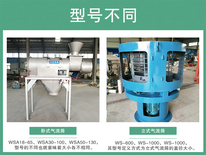 立式氣流篩:WS-600、WS-1000、WS-1000,其型號(hào)定義方式為立式氣流篩的直徑大小。