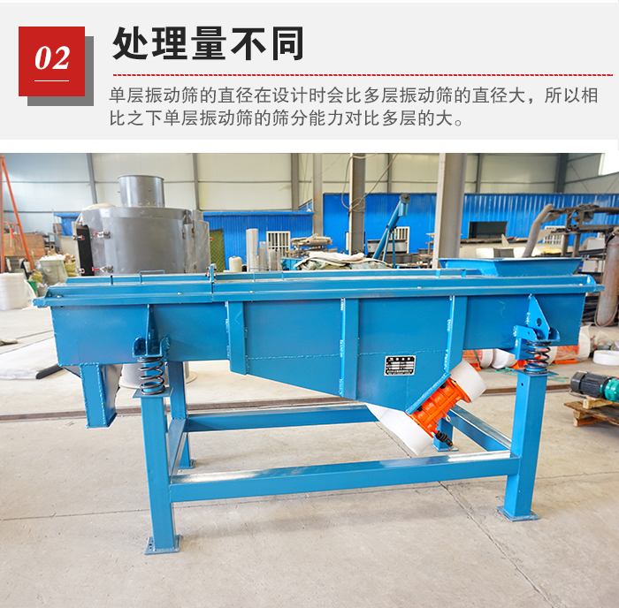 單層振動篩與多層振動篩在物料的篩分結果中會有,不同的分級例如:單層振動篩在篩分物料的時候只能篩分出兩種不同級別的物料,而多層振動篩就能夠篩分出多種不同級別的物料。
