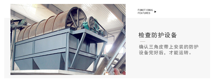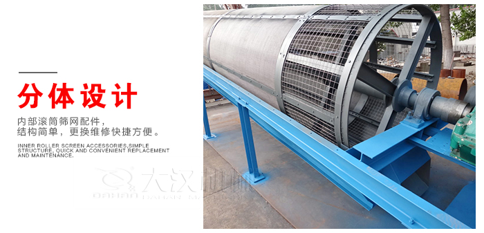 滾筒篩篩沙機(jī)主要由電機(jī)、減速機(jī)、滾筒裝置、機(jī)架、密封蓋、進(jìn)料口、出料口等部分組成。滾筒裝置傾斜安裝于機(jī)架上。電動機(jī)經(jīng)減速機(jī)與滾筒裝置通過聯(lián)軸器連接在一起,驅(qū)動滾筒裝置繞其軸線轉(zhuǎn)動。當(dāng)物料進(jìn)入滾筒裝置后,由于滾筒裝置的傾斜與轉(zhuǎn)動,使篩面上的物料翻轉(zhuǎn)與滾動,使合格物料(篩下產(chǎn)品)經(jīng)滾筒后端底部的出料口排出,不合格的物料(篩上產(chǎn)品)經(jīng)滾筒尾部的排料口排出。由于物料在滾筒內(nèi)的翻轉(zhuǎn)、滾動,使卡在篩孔中的物料可被彈出,防止篩孔堵塞。